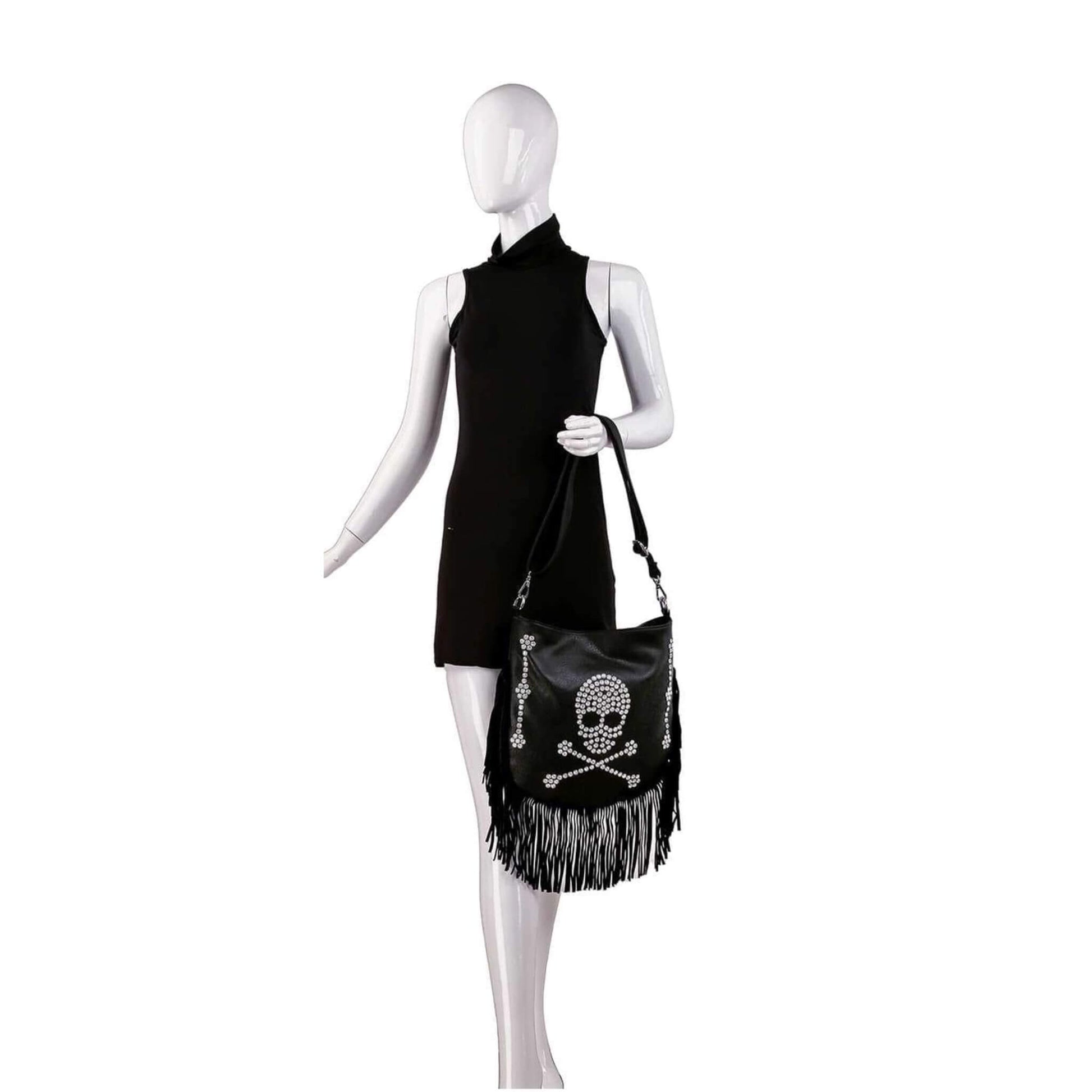Turn heads with the Rhinestone Skull Fringe Shoulder Bag, where rocker chic meets full-on glam. Featuring a bold rhinestone Jolly Roger design, swinging fringe detail, and a roomy shape, this bag screams statement piece.